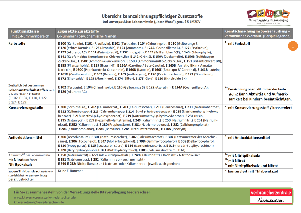 Übersicht kennzeichnungspflichtiger Zusatzstoffe gemäß Lebensmittelrecht – nutzbar zur entsprechenden Deklaration von Speiseplänen
